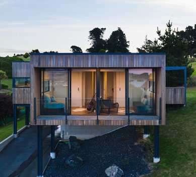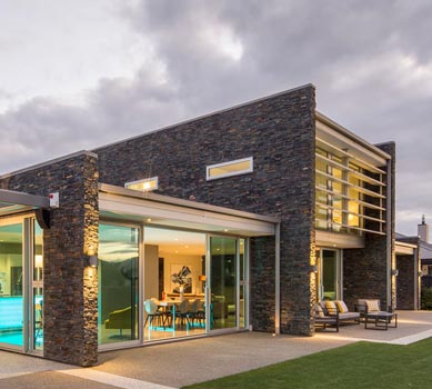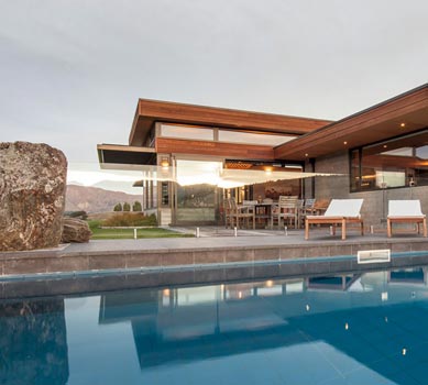Natural materials feature strongly in this beautiful Wanaka holiday house. The home comprises three pavilions linked by flat roofs and glass walls with their interior relaxed, suited to holidaying.
