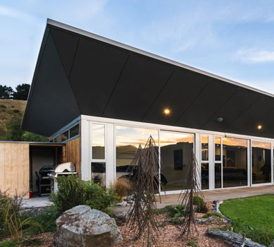 Strong linear lines and an overhanging soffit create a striking effect on this family home, overlooking the Dunedin harbour.