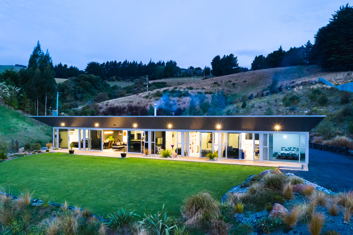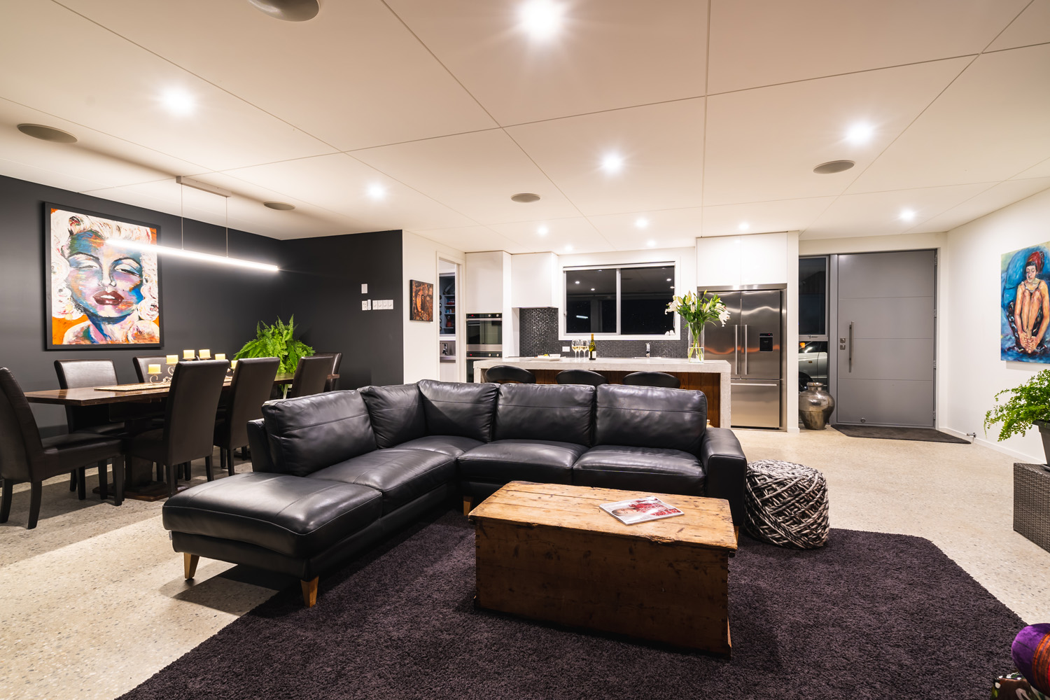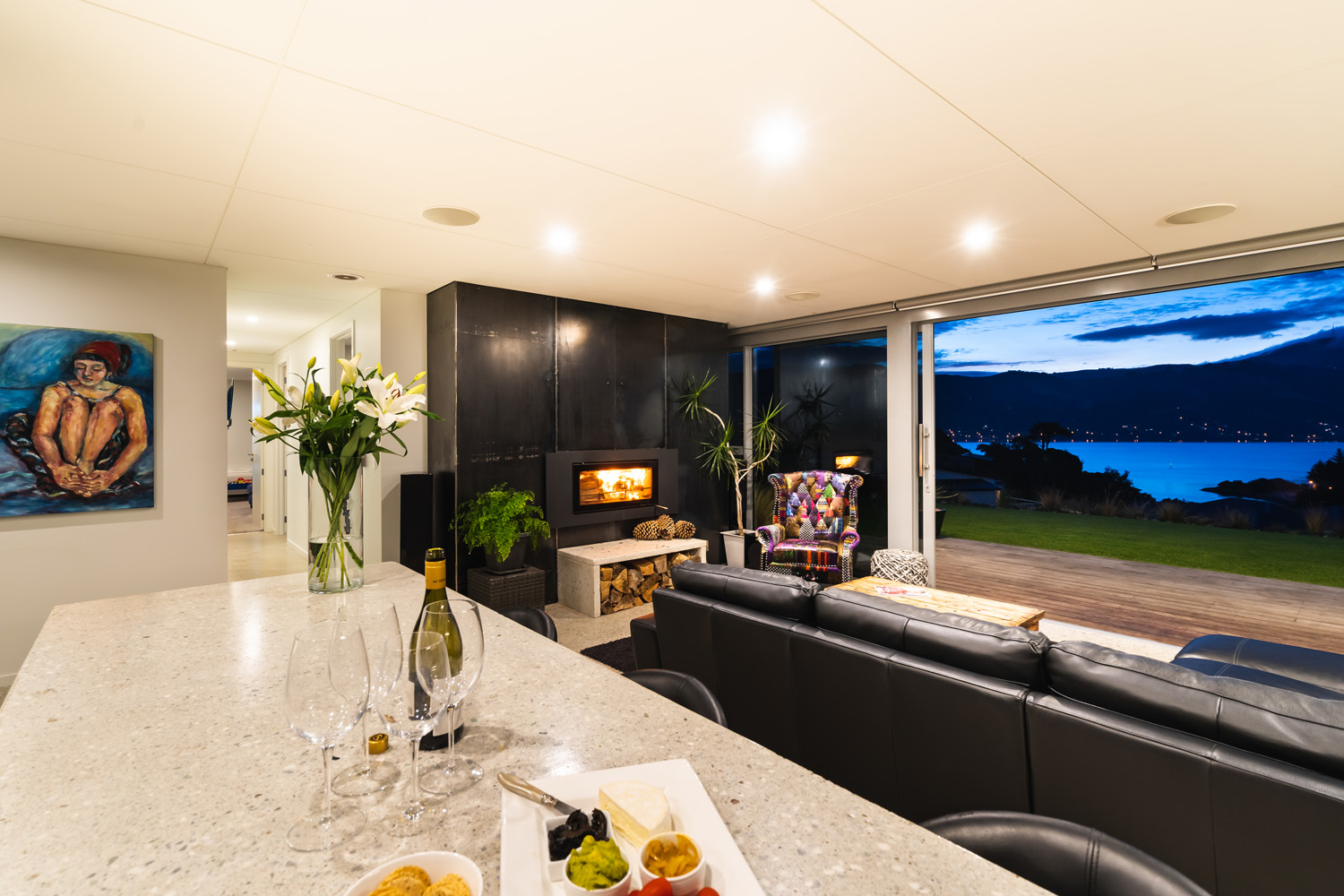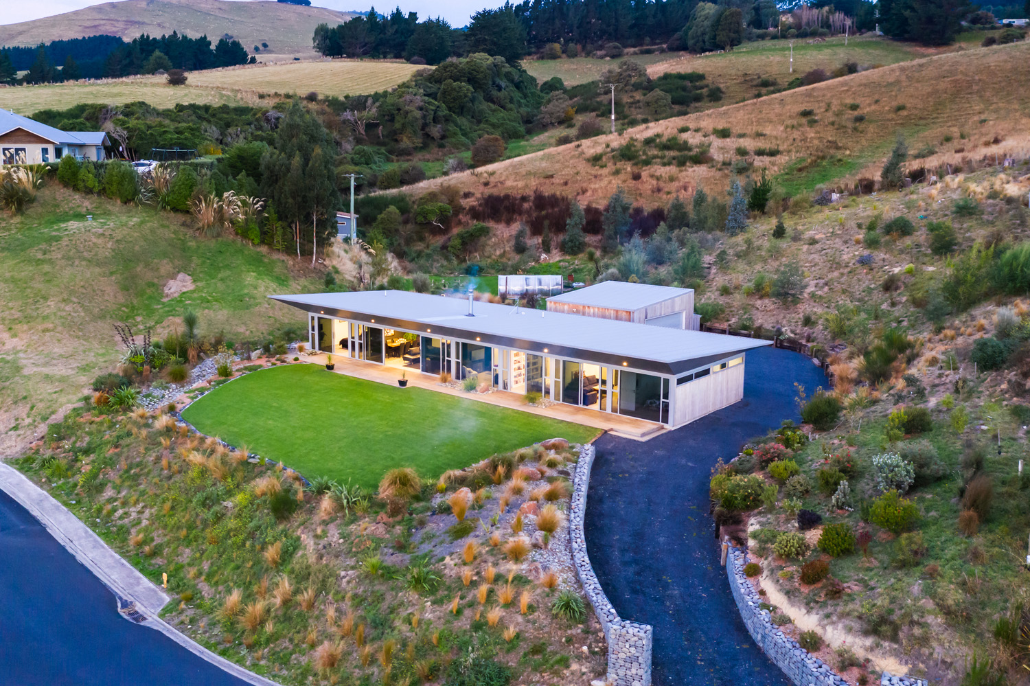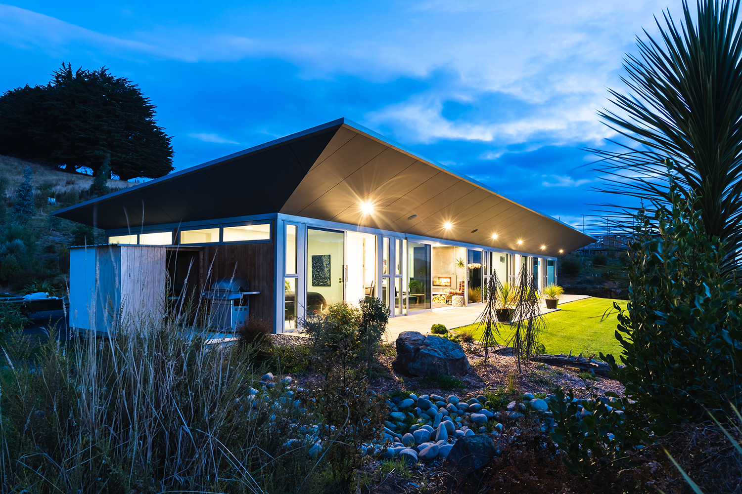 Cedar cladding and a colour steel roof were chosen as cost effective exterior cladding materials. Roof and soffit construction was custom designed using inverted timber trusses eliminating the requirement for structural steel. Polished concrete floors and bench top plus a recycled mild steel sheet panelled wall for the in-built wood fire feature in the interiors. Resene eco paints and non-toxic materials were used for a healthy environment for the client and dependent daughter.