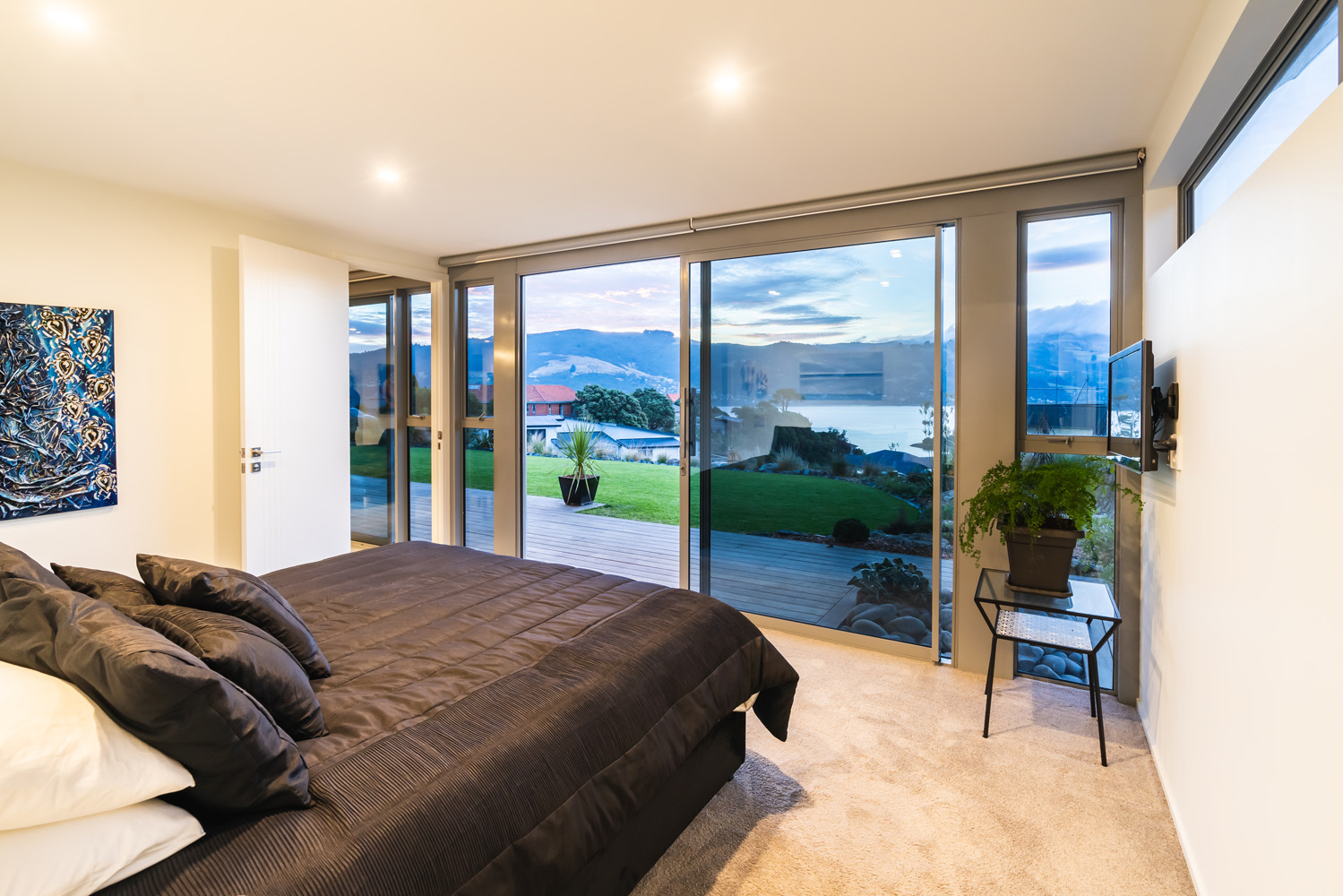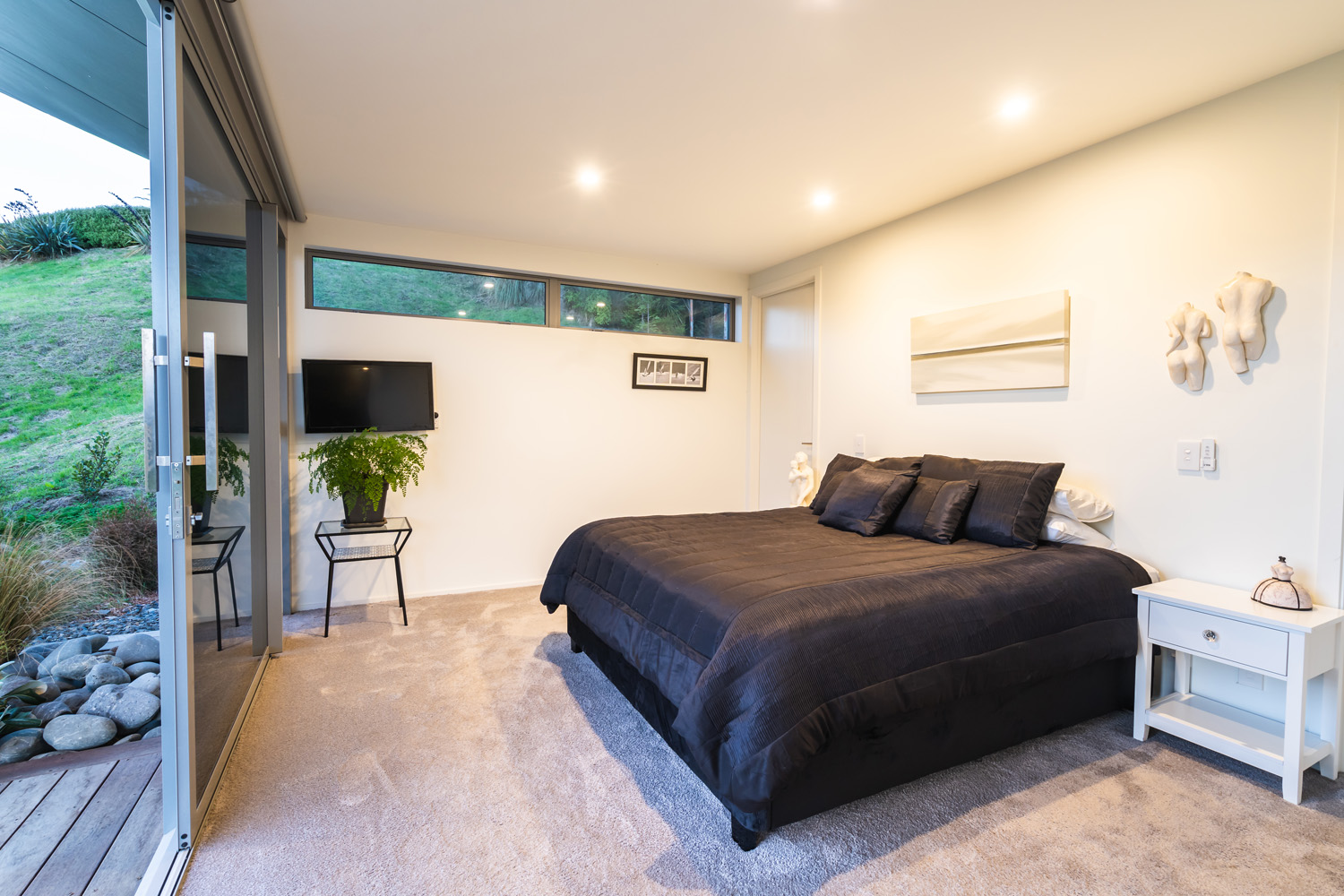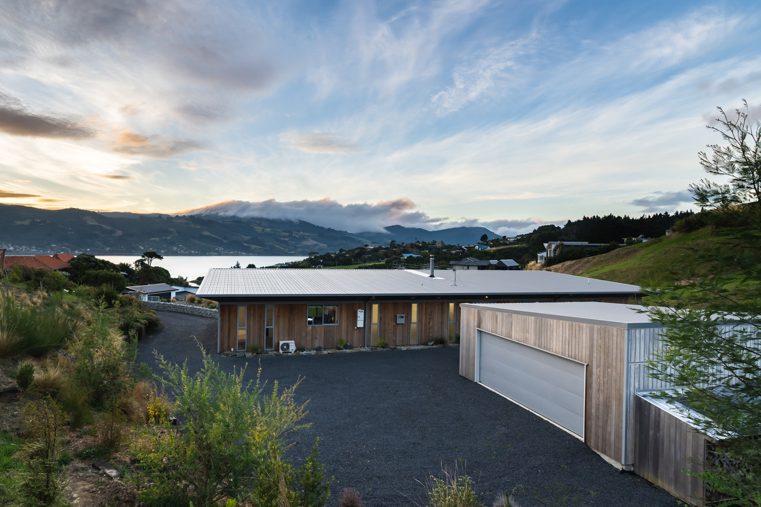 This project is located on a sloping hillside with a rural view south, a harbour view north and neighbouring houses nearby east and west. The client sought a single storey home which includes a family flat for their dependant daughter with a regulatory requirement to share the laundry and services. A separate double garage was requested to be detached from the house with off street parking, entrance court and service court provided. Both the home and flat were to enjoy harbour views north and rural views south with maximum sun in the winter and shade in summer. A large outdoor living area of deck, lawn and garden areas to the perimeter was requested to be sheltered from the prevailing wind. The building was to be clad in cedar with a roof overhang and interiors were to include polished concrete and steel. The client sought cost effective construction and finishes to match a restrictive project budget.