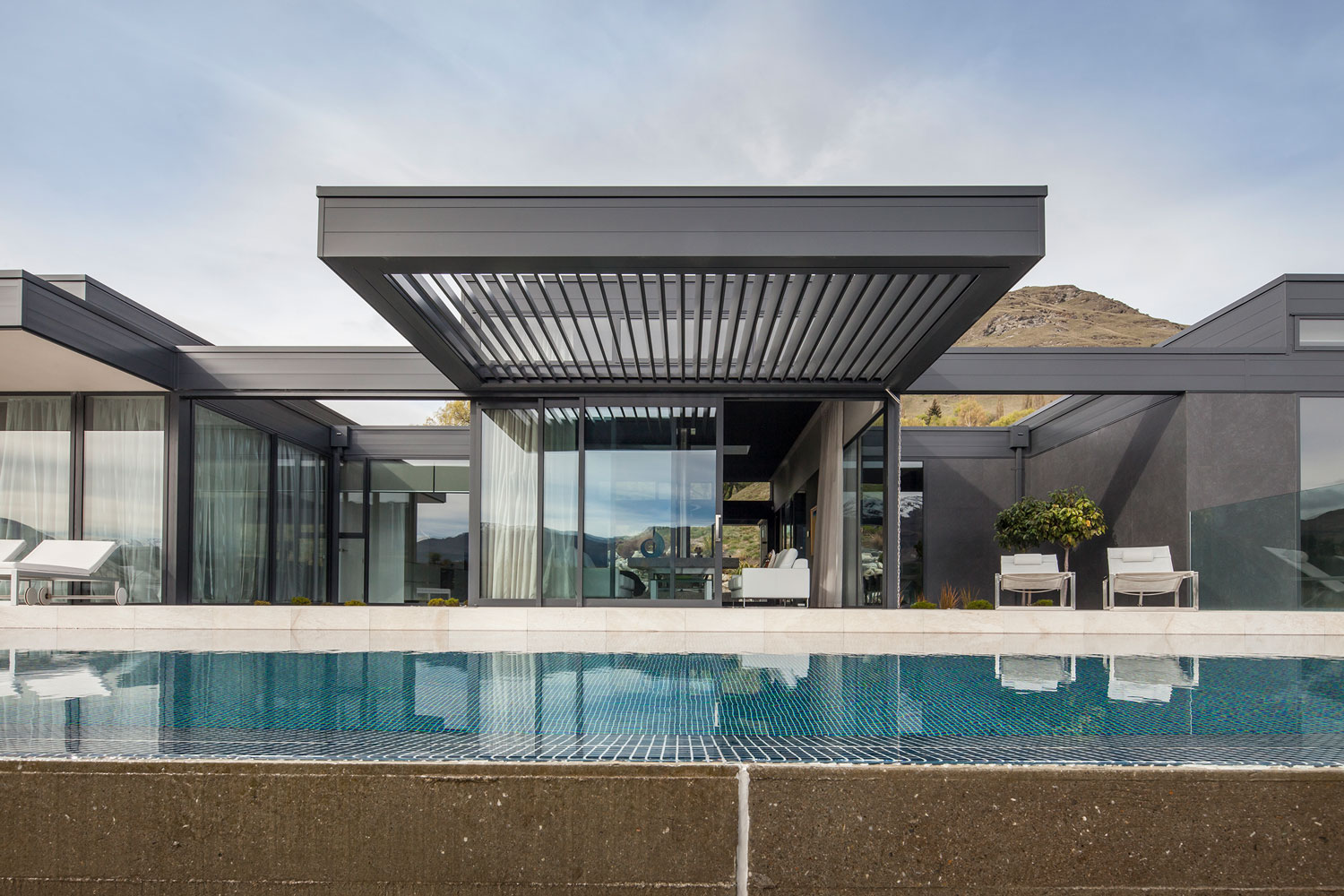 Different aspects of the scenery are revealed along the way, but it is not until you reach the forecourt, ascend the stair and pass through the living space out to the pool and terrace that the majesty of the panoramic setting is fully experienced. The house immerses itself in the environment in many ways, in addition to the relaxing sounds from the river below; a stream fed pond on an upper level brings the gentle murmur of water resonating through the living area.