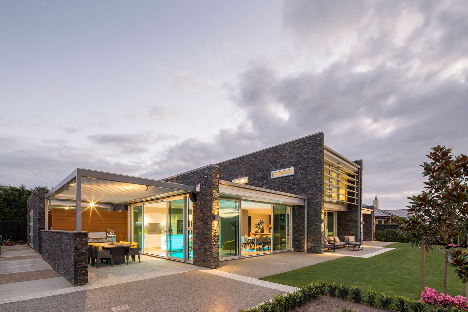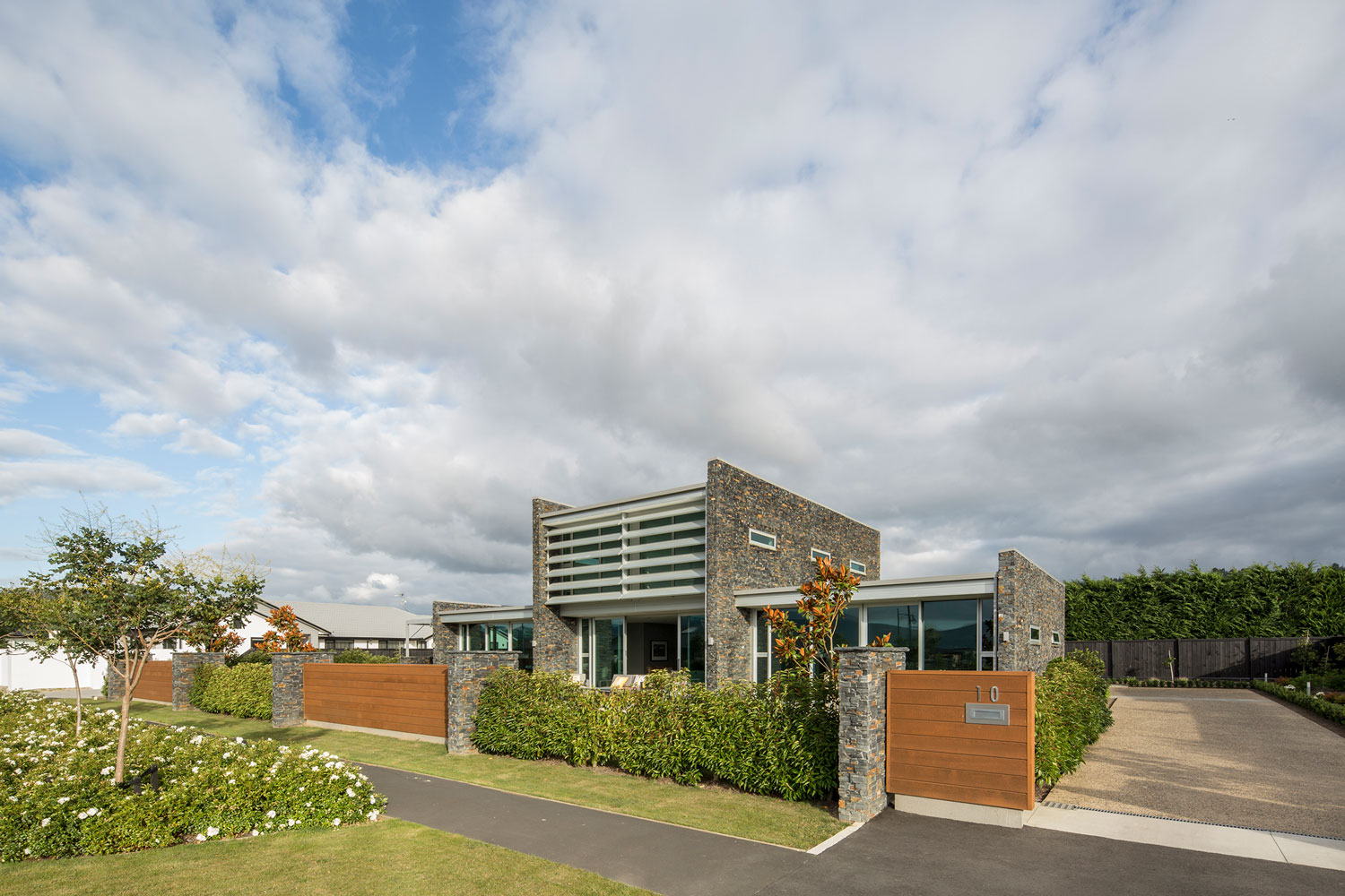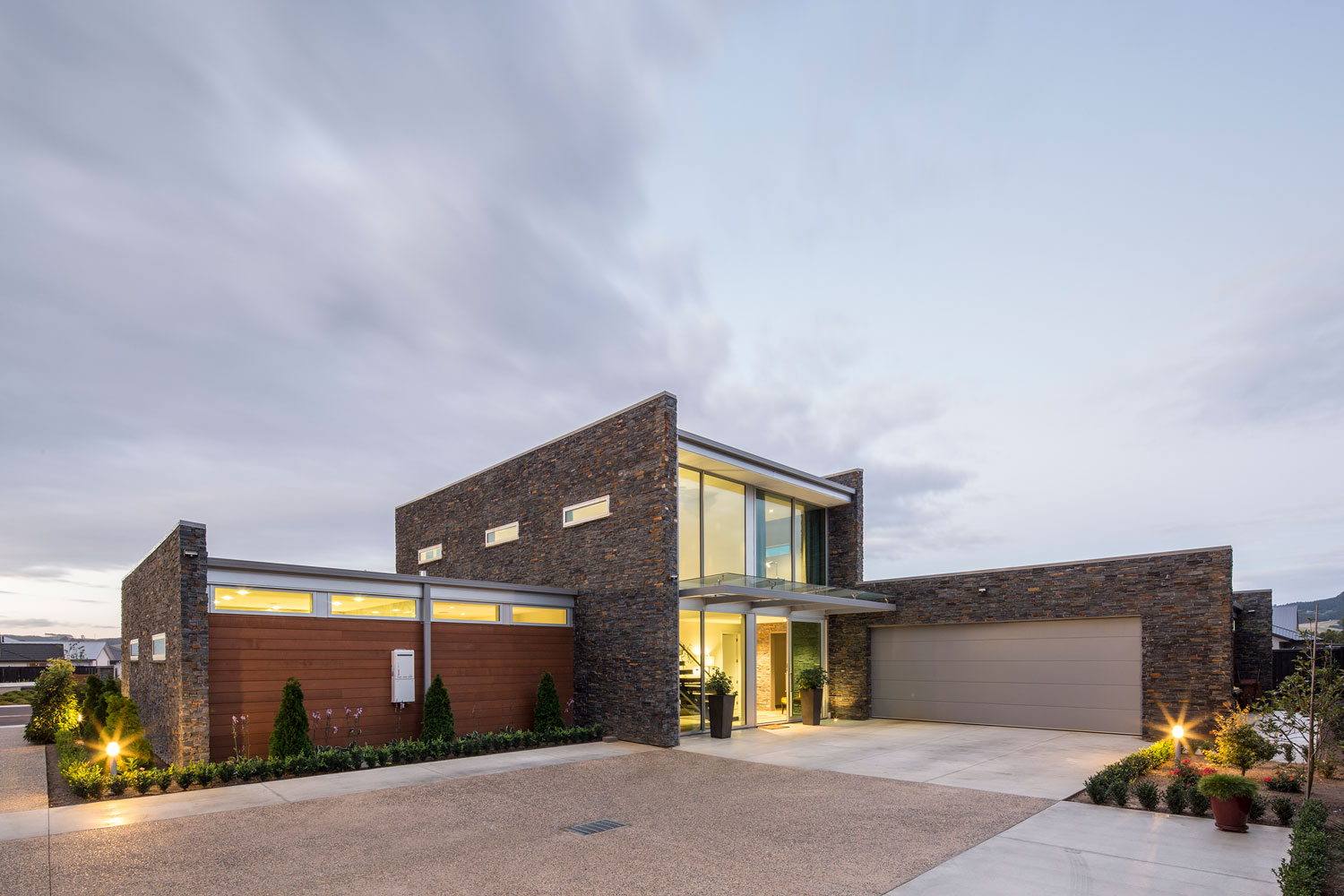 Stone blades with cedar, glass, aluminium, polished concrete floors and lighting effects are woven together with the site in a way which defines a point of difference, without detracting from the character of the Highland Park subdivision. The house planning links the interior and exterior by marrying seamless, materiality and geometry to provide a bespoke and contemporary living arrangement.