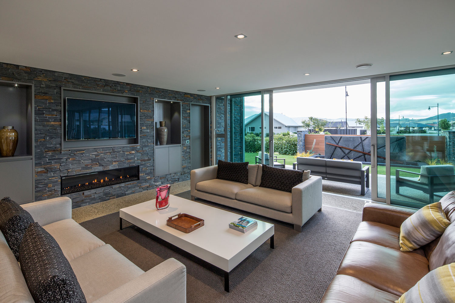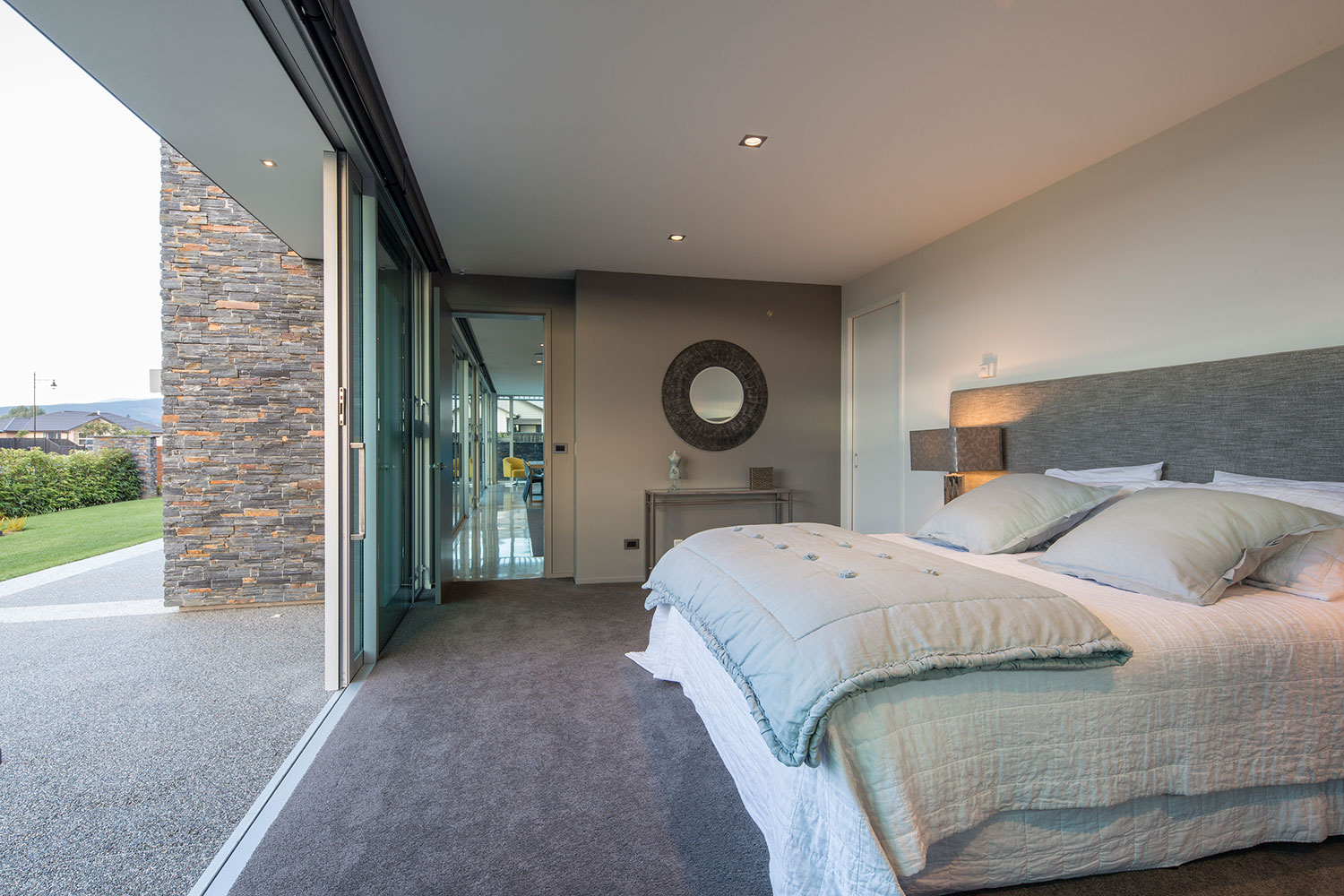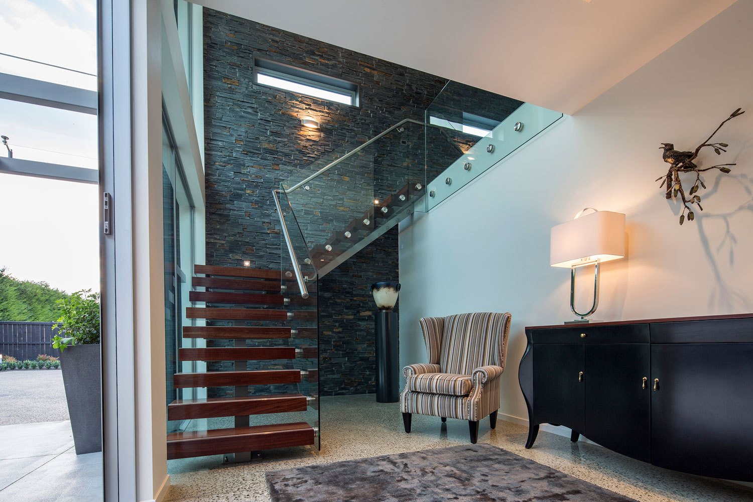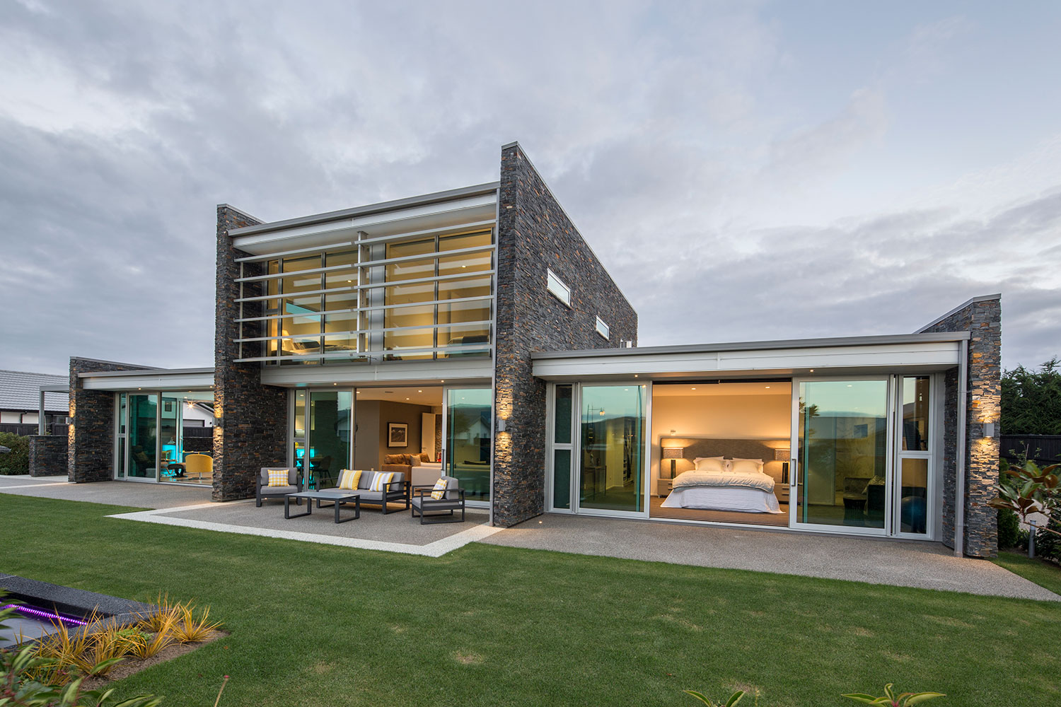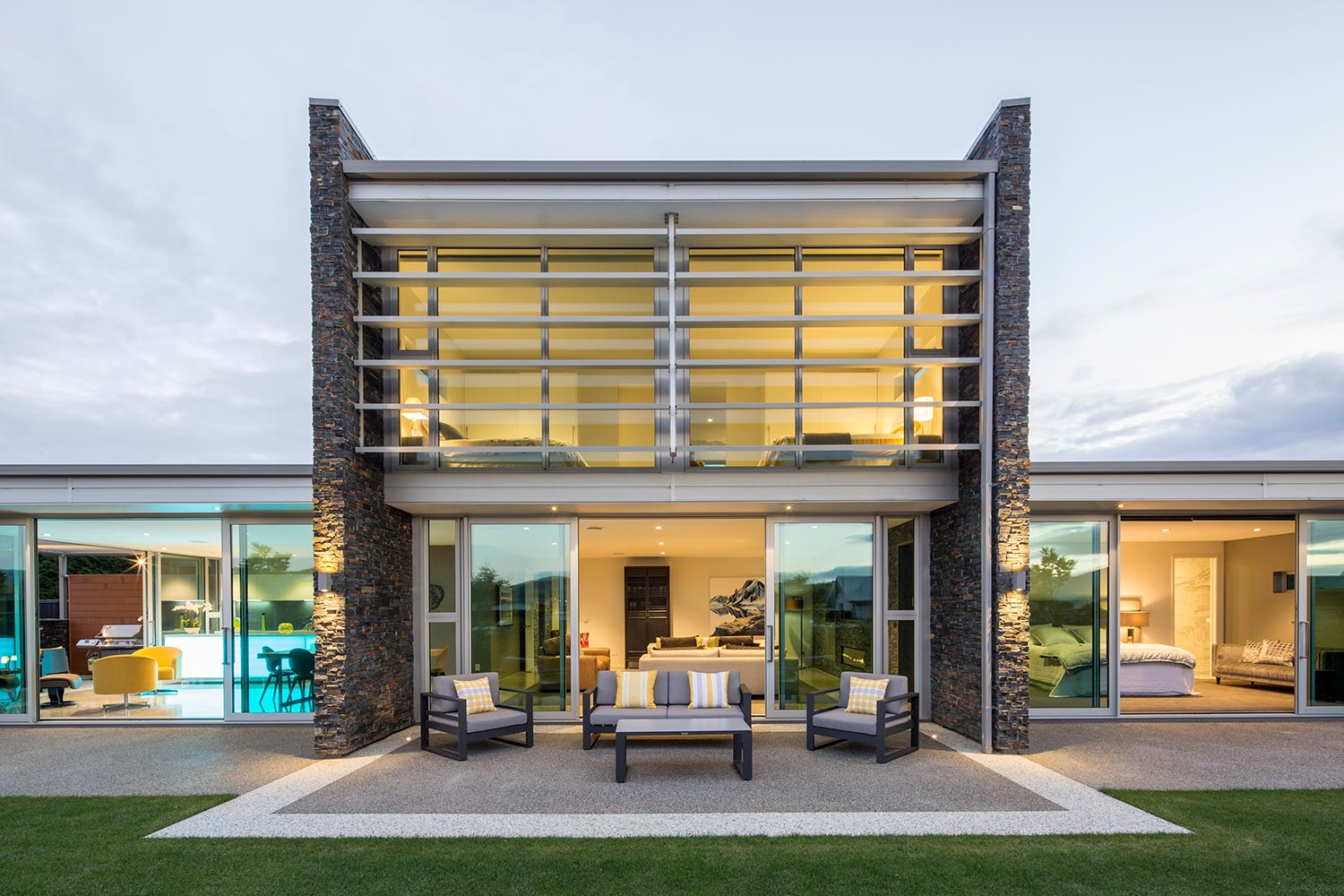 With respect for the living requirements of a retired couple, the master suite, Living, and Kitchen/Dining areas are arranged in three bays defined by stone blades. These three primary living spaces open out to courtyards with landscaping to the north and East. Two central stone blades rise to form the separate guest upper storey connected by a feature timber and glass staircase in a double height Entry. Upper level glass walls capture views of the Maungatua Hills to the north and the Chain Hills to the south. A feature stone blade provides a connective spine linking Entry Court, interior spaces and outdoor Living Court. The clients love the resultant modern home.