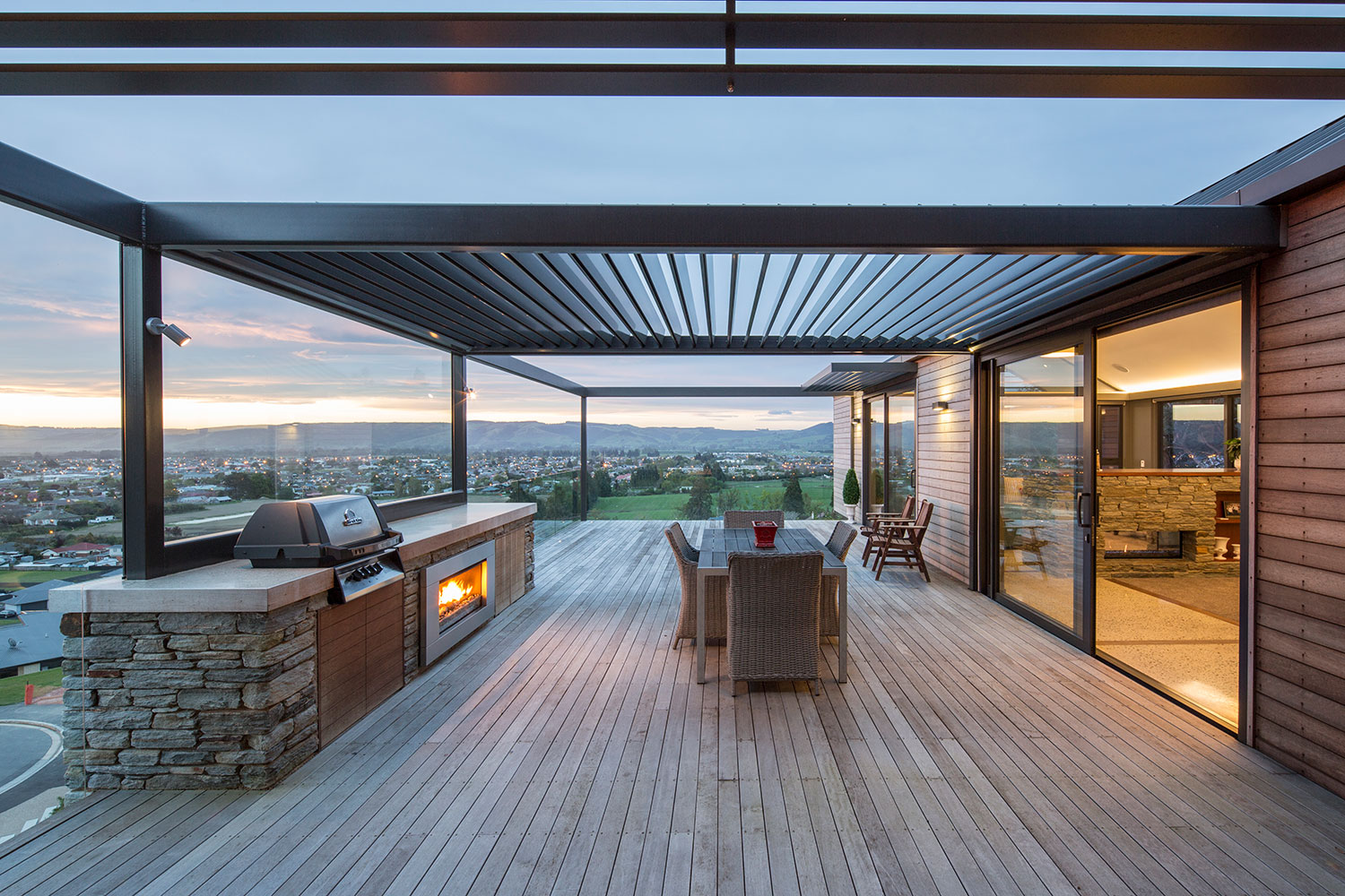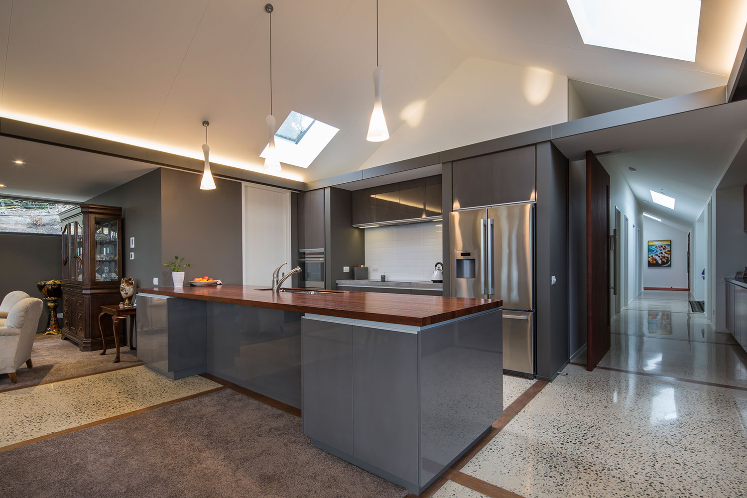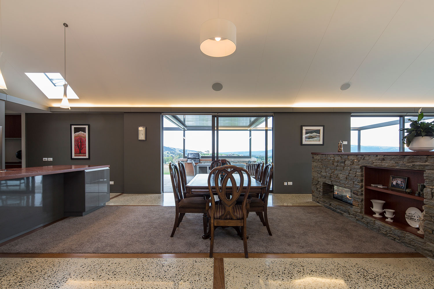 The client sought a single level family home that maximised views from a steep elevated site and incorporated several outdoor spaces for different times of the day during their retirement. They were from a farming and building background so where interested in referencing traditional gabled barns with an interpretive modern styling for the exterior and interior image and layout.