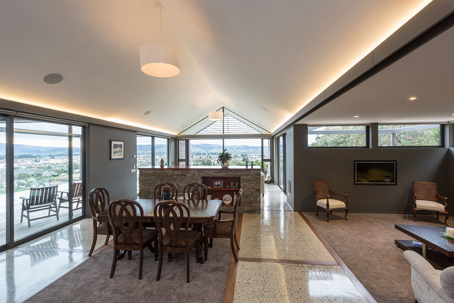 The house is conceptualised as long offset gabled building forms with outdoor living decks located for east morning sun, north midday sun and west evening sun. The house is located at the rear of the site orientated as high as possible to take full advantage of an elevated and commanding view of the Mosgiel Township, Taieri Plains and Maungatua Range whilst maximising the best daylight and solar gain.