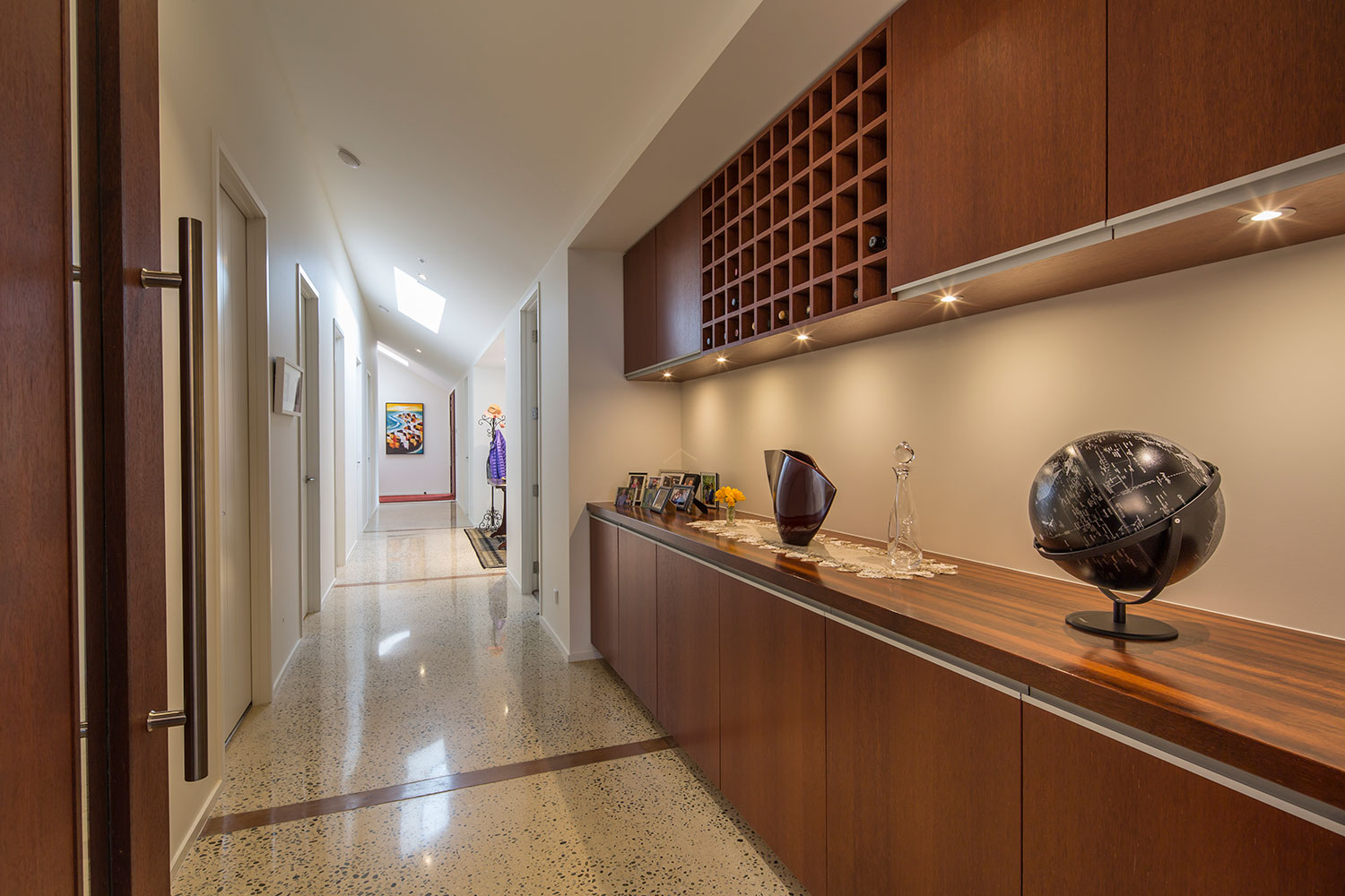 The house has a natural material and colour palette of stained cedar wall cladding, Iron Sand euro tray roofing and steelwork, schist stone walls and exposed aggregate concrete paving and driveway. Polished concrete floor with timber inlays and soft tonal paint combinations for walls and ceilings provide light, spacious interiors that defer to capture outstanding views.