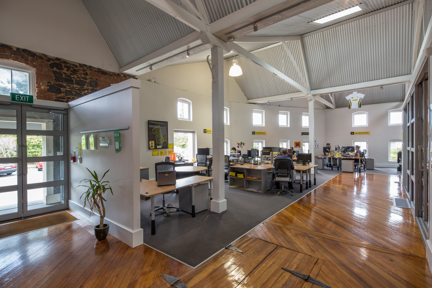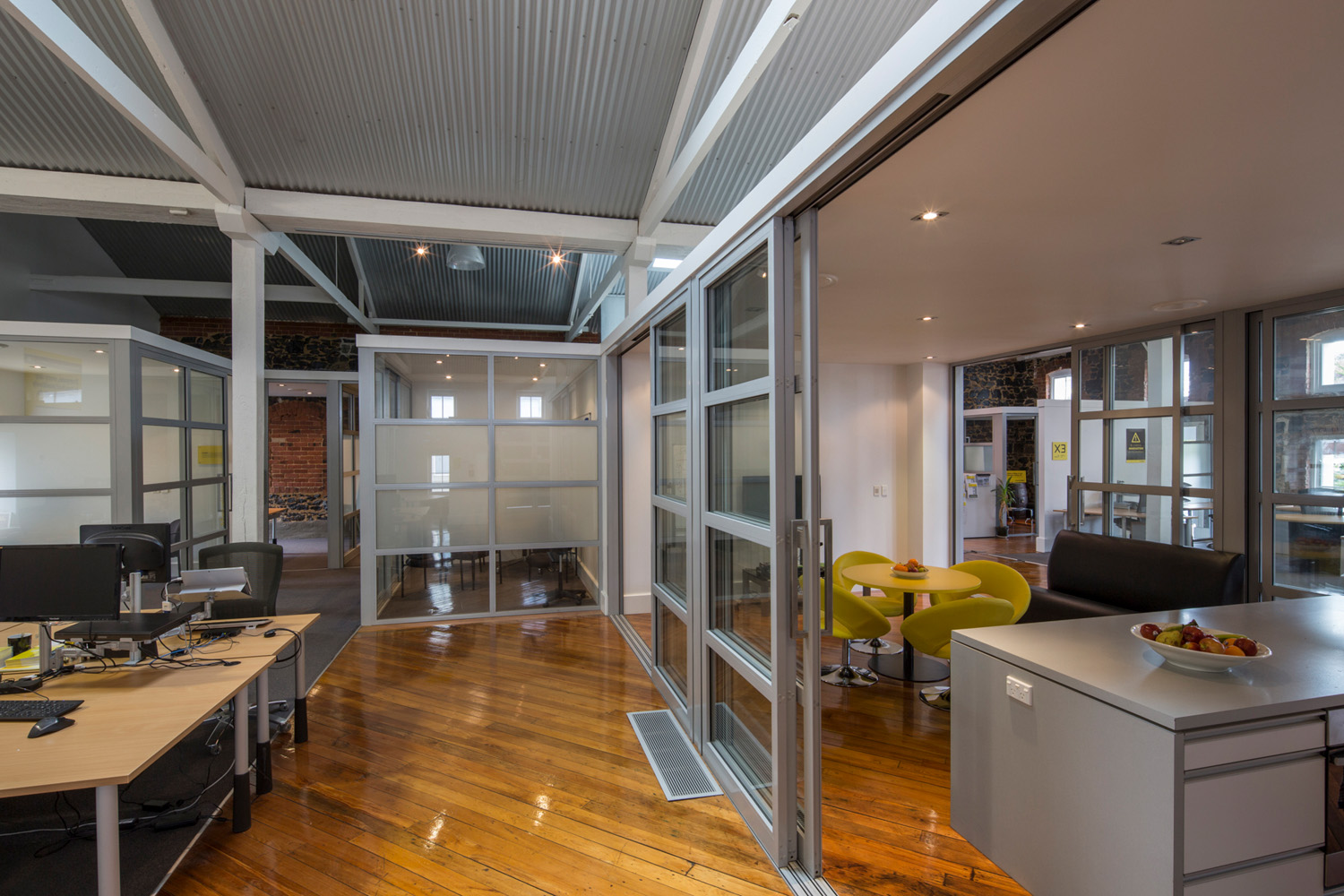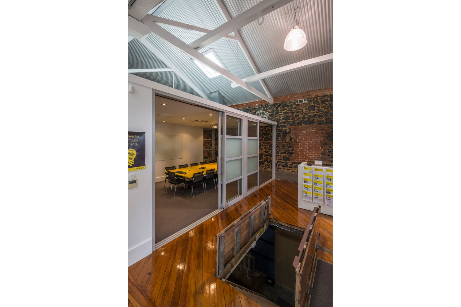 Our response was to rebrand the office tenancy featuring their corporate yellow colour, polish timber floors and add transparent meeting rooms with glazed walls to preserve a spacious interior.