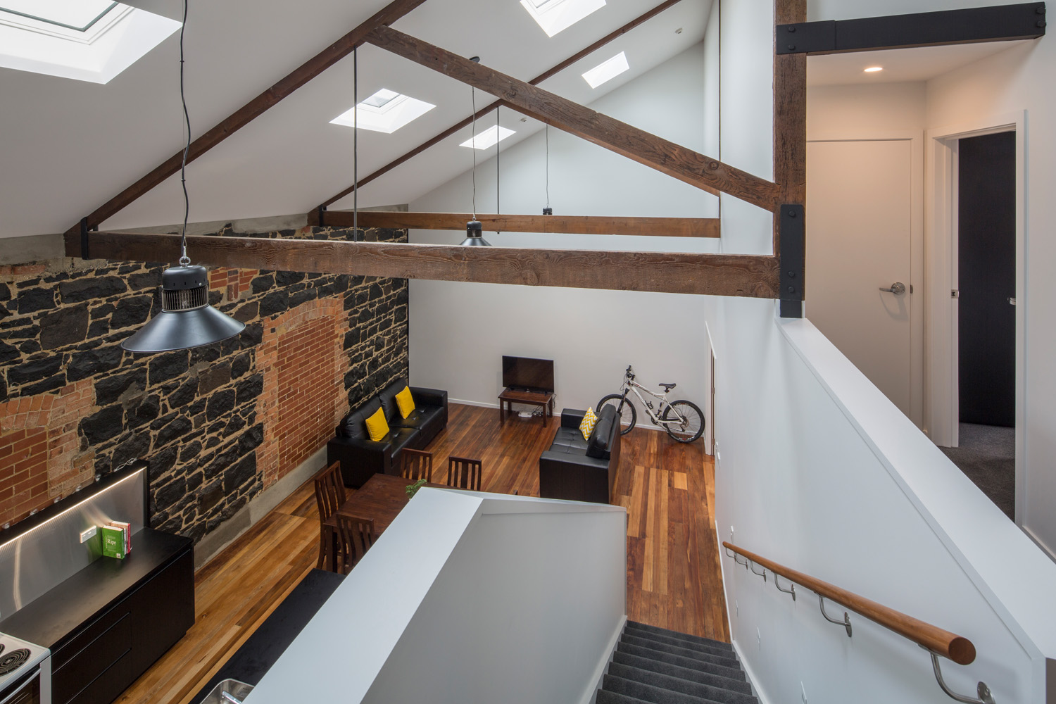 The layout was arranged to maintain the integrity of roof trusses and gain the best sun light and views from the northern aspect. The commercial and residential tenants are as delighted as the proud owner with the meld of old and new character within these interiors.
